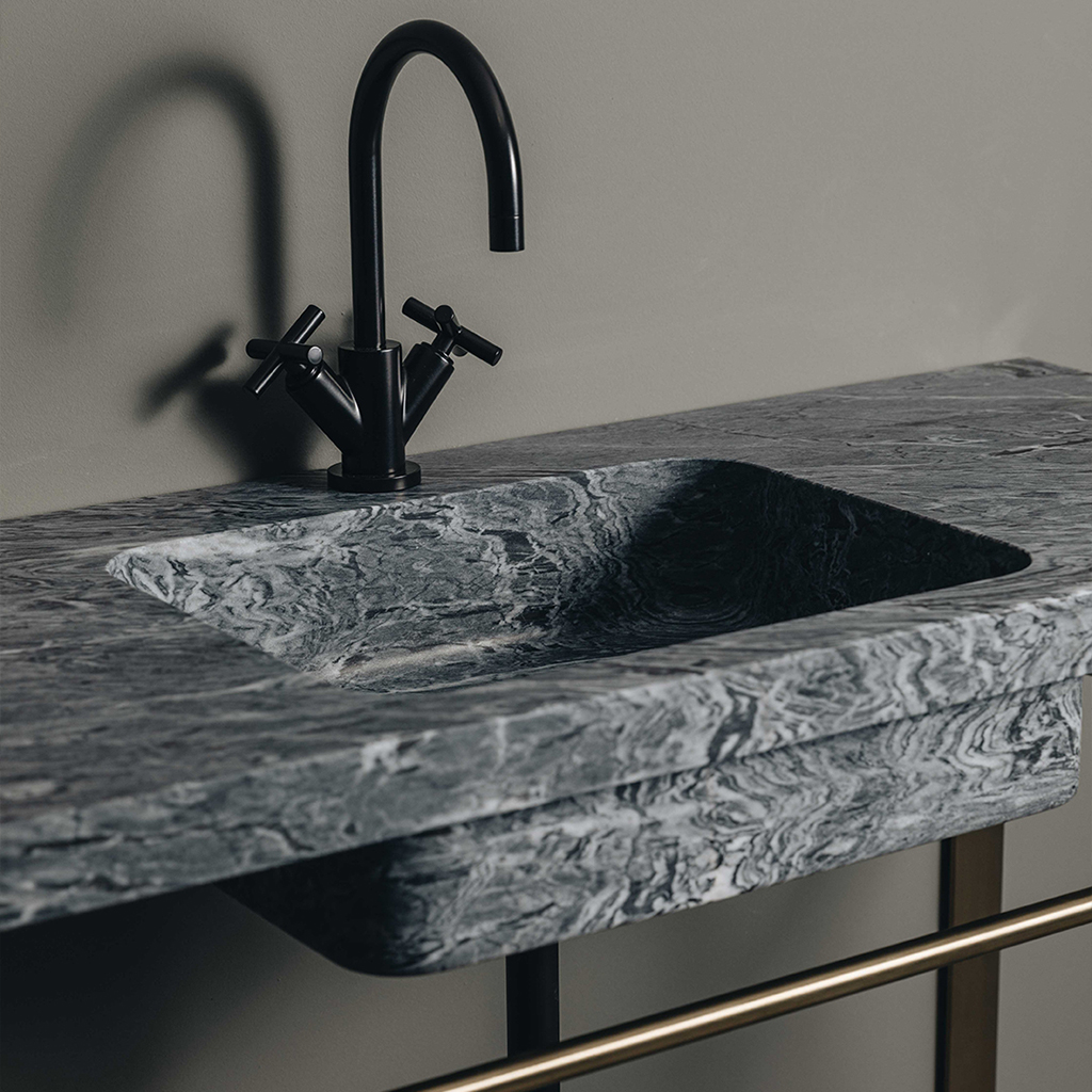 Ruivina, with its bluish-grey base and irregular white and brownish veins, offers a dramatic and contemporary character, increasingly valued in modern design projects.